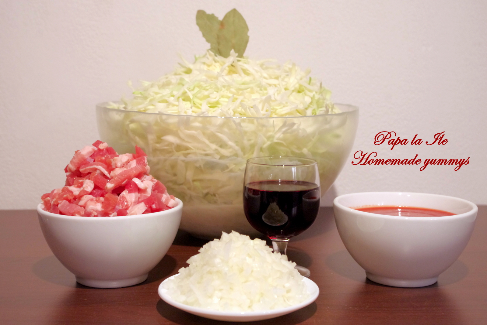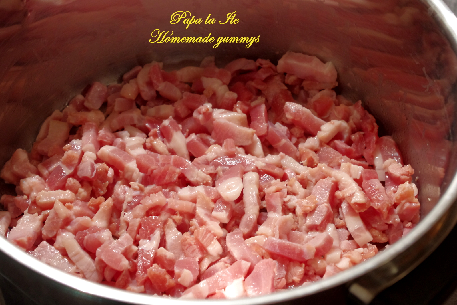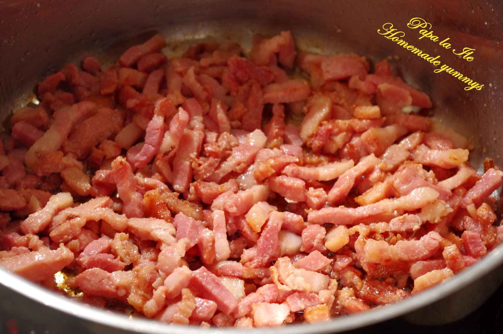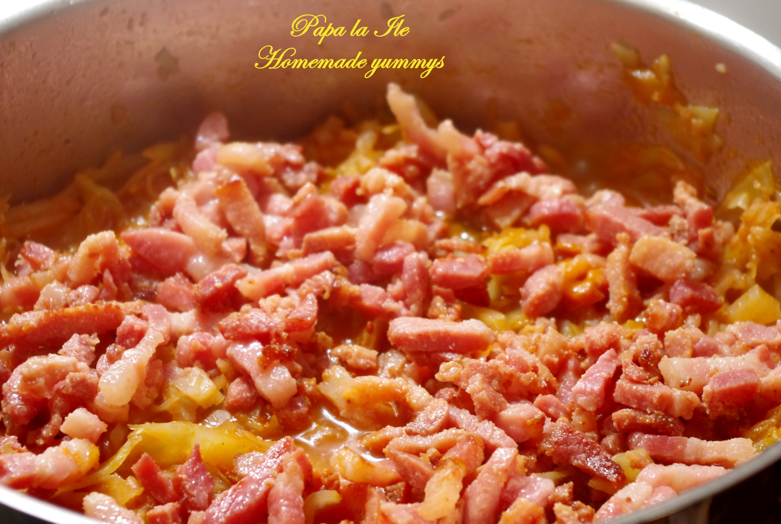 Am mai folosit cam 400-500 gr de lardons fume, care e un fel de kaiser afumat și care aici se vinde gata tăiat fâșii subțiri, o ceapă mare tăiată cubulețe, 400 ml suc de roșii, 150 ml vin roșu, 2 foi de dafin, piper, ardei iute.