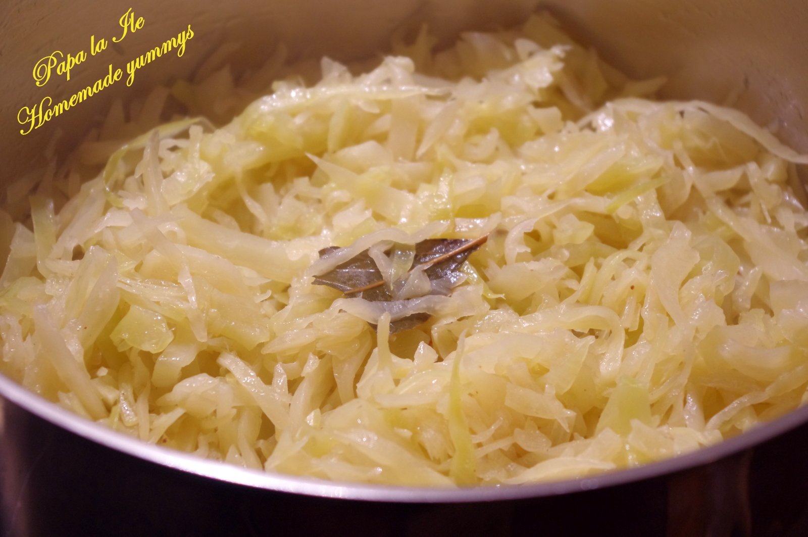 Când s-a înmuiat și a devenit translucidă am pus varza tocată. Greu am îndesat-o pe toată. Am mai pus 300 ml de apă și ceva ulei, nu prea mult. Am pus și frunzele de dafin rupte în două.